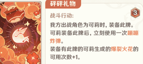 可莉装备词牌,可以使用一次蹦蹦炸弹,并且生成爆裂火花可用次数加一。