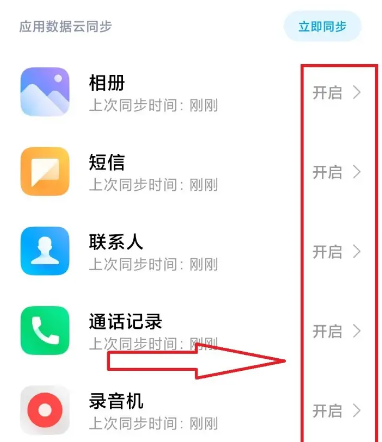 6、最后按照自己要求,选择想要同步的数据“开启”即可。